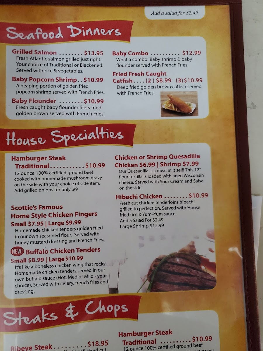 Don't miss the salad bar, offering fresh and diverse options. The homemade desserts, particularly the peach pie, are the perfect ending to any meal. Experience the warmth and culinary passion at Scottie's—you'll surely want to return!